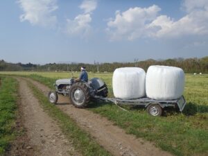 2)牧草ロールの運搬は、牧草地に置かれた牧草ロールをローダとトラクター(学生、卒業生で復活させたFergusonのトラクターも活躍)を使い、牛舎の裏の一箇所に集める作業です。みなさんの手際の良い作業により、二日間で100個近いロールをすべて、牛舎の裏に運搬することができました。