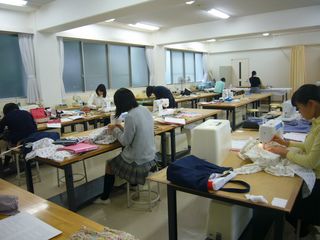 午前中は、雨で移動も大変でしたので、生活創作館と新体操館のニ箇所を見学。高等科一年生がパジャマや袖なしスモックを制作している裁縫の授業では、昔と変わらない型紙や作り方を懐かしんだり、電動ミシンに驚いたり、熱心に質問をして、それぞれに時間を過ごされた様子です。新体操館での楽しそうなバスケットの授業では、入り口で大きな声できちんと挨拶をしてくれた生徒さんに、こちらまで若さと元気をいただいた気がしました。