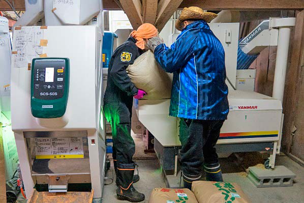 米(籾付き)を機械に投入。この機械で籾殻を取り除き未成熟・不良米を選別します。