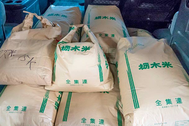 トラック荷台に乗っているのが、今年の成果です(籾付きの状態)