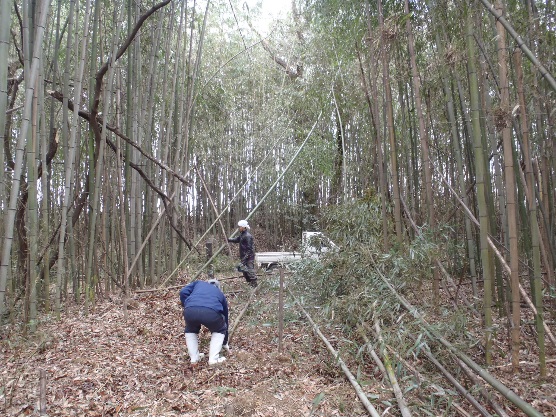 前日の蛇尾川沿いの道から幹線道路側放牧地へ向けて竹藪の中を牧柵が張ってあり、そこを復旧させる作業を重点的に行いました。