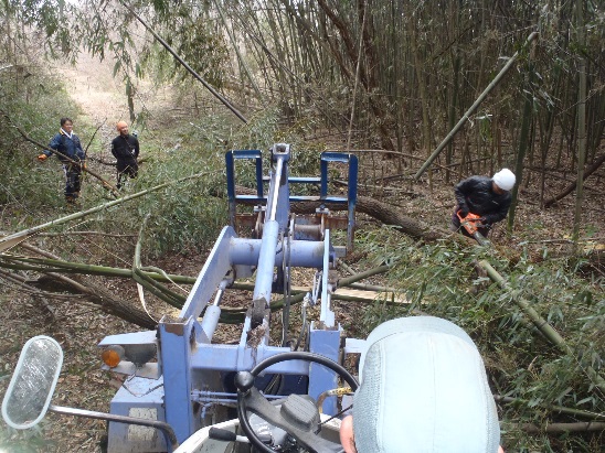 チェーンソー及びエンジンカッター(竹用専用刃取付)で、どんどん竹を切り払い、運び出します。