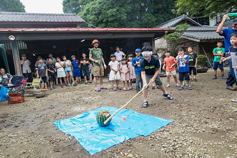 川掃除の後、BBQに招待頂きました。子供たちがつかみ取りした魚を塩焼きに/恒例のスイカ割