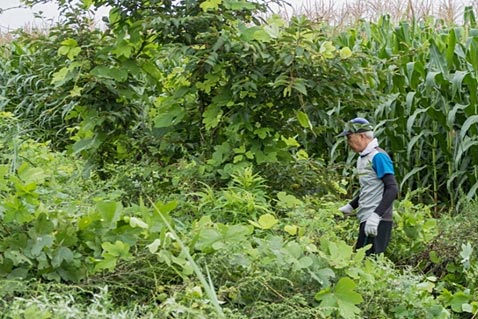 今回一番きつかった作業。桜に絡まったツルを鎌で刈り取りながら、エンジンカッターで草刈り