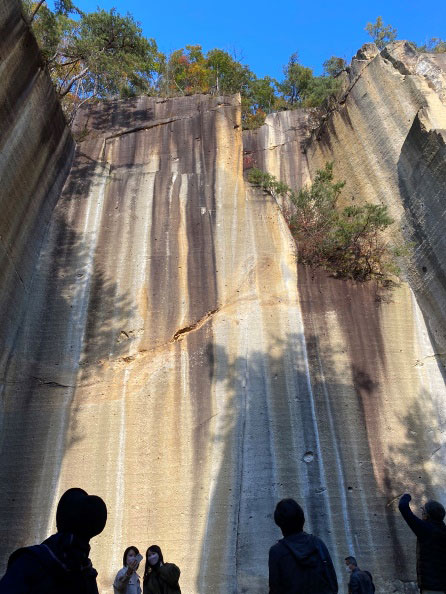 その後立ち寄った瓜割石庭公園は、大谷石と同じ軽石質凝灰岩である「高畠石」を切り出した跡地で、切り立った岩山にぽっかりと開いた広場では校歌を歌って、岩壁に響く歌声を楽しみました。