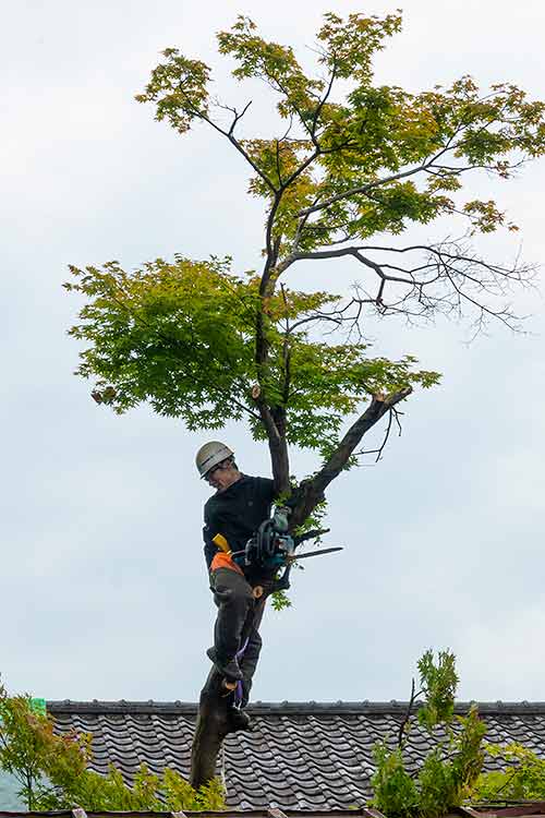 除染作業は、前日線量が下がらなかった食堂裏の紅葉の枝払いから始めました。切り倒すことも考えましたが、場所が狭く重機も近づけないので、屋根にかかる枝を払うことになりました。木に登り、チェーンソーで枝を払っていきます。安全帯やスリングを使って安全確保する作業は、とても手慣れたものでした。